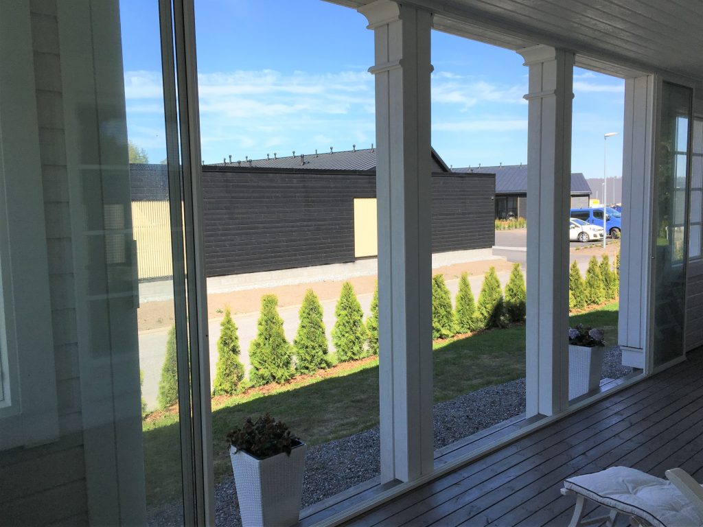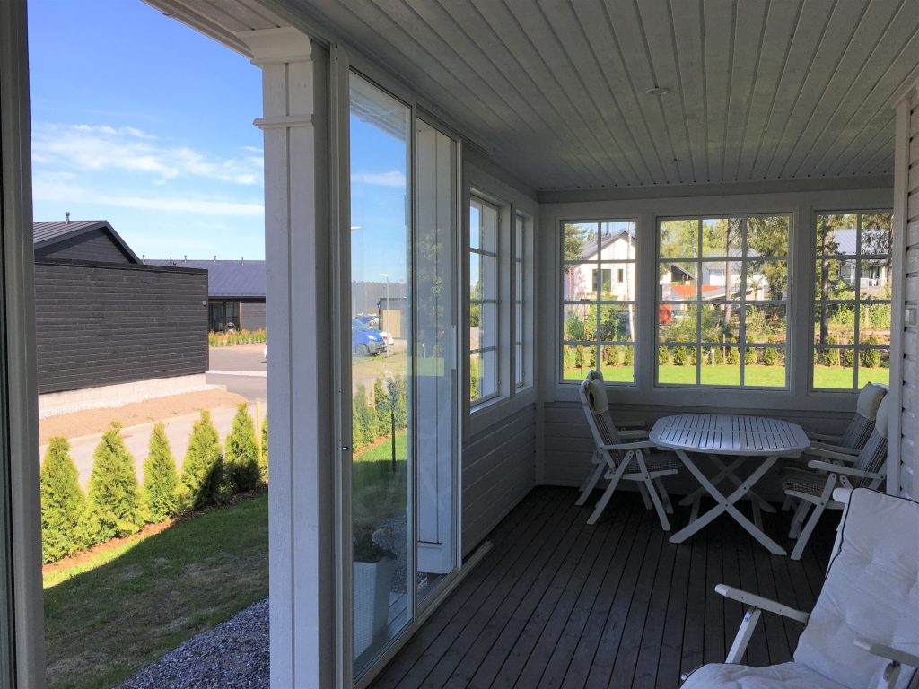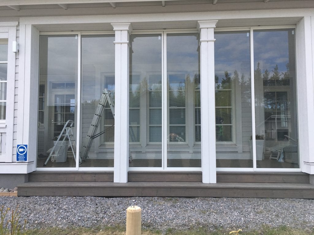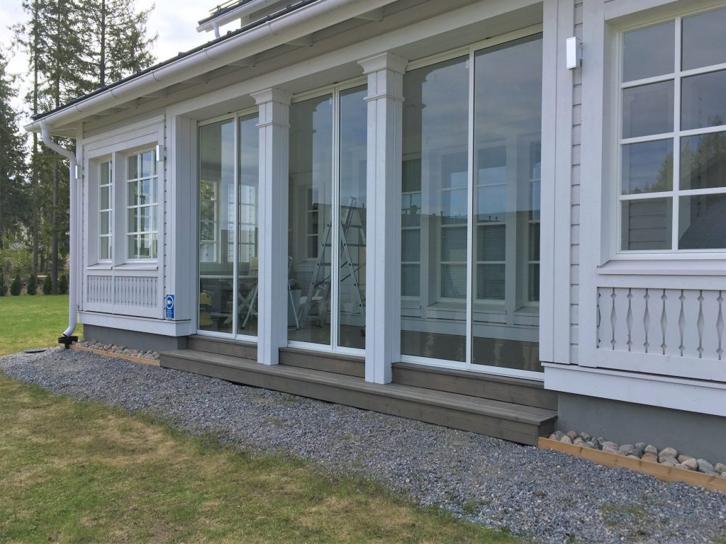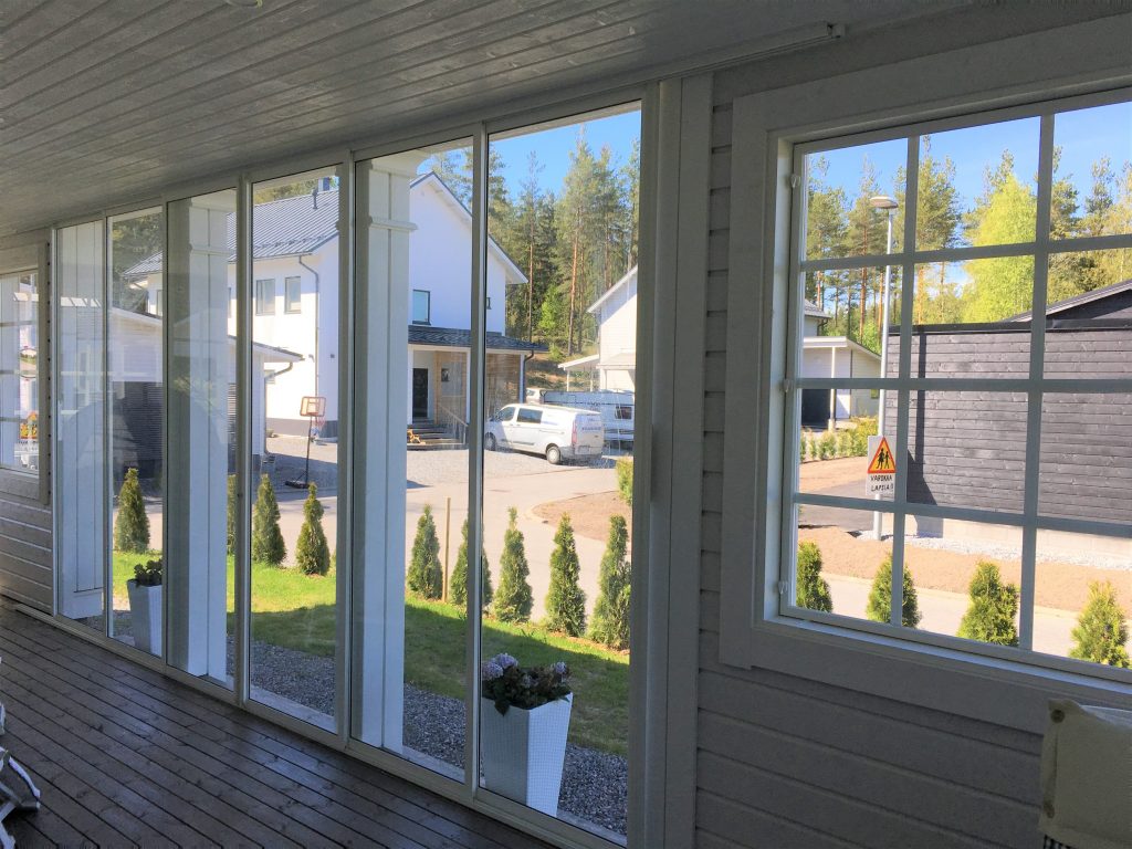 Kuisti viimeistellään liukulaseilla KuninkojallaLiukulasit, Omakotitalot - omakotitalojen lasitukset / 4.5.2019 KOHDE: Omakotitalo Kuninkoja, Raisio TUOTTEET: Pystypuitteelliset liukulasit