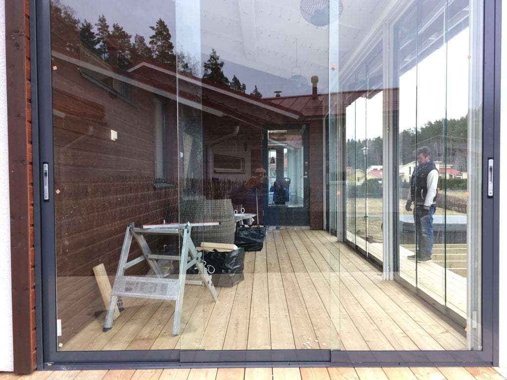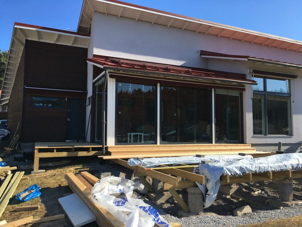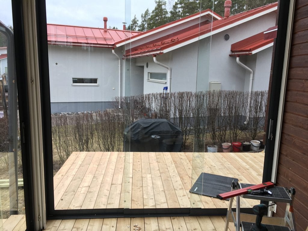 Remontin yhteydessä katettin osa terassiaLiukulasit, Omakotitalot - omakotitalojen lasitukset / 4.4.2019 KOHDE: Omakotitalo Hirvensalo, Turku TUOTTEET: Pystypuitteeton liukulasi