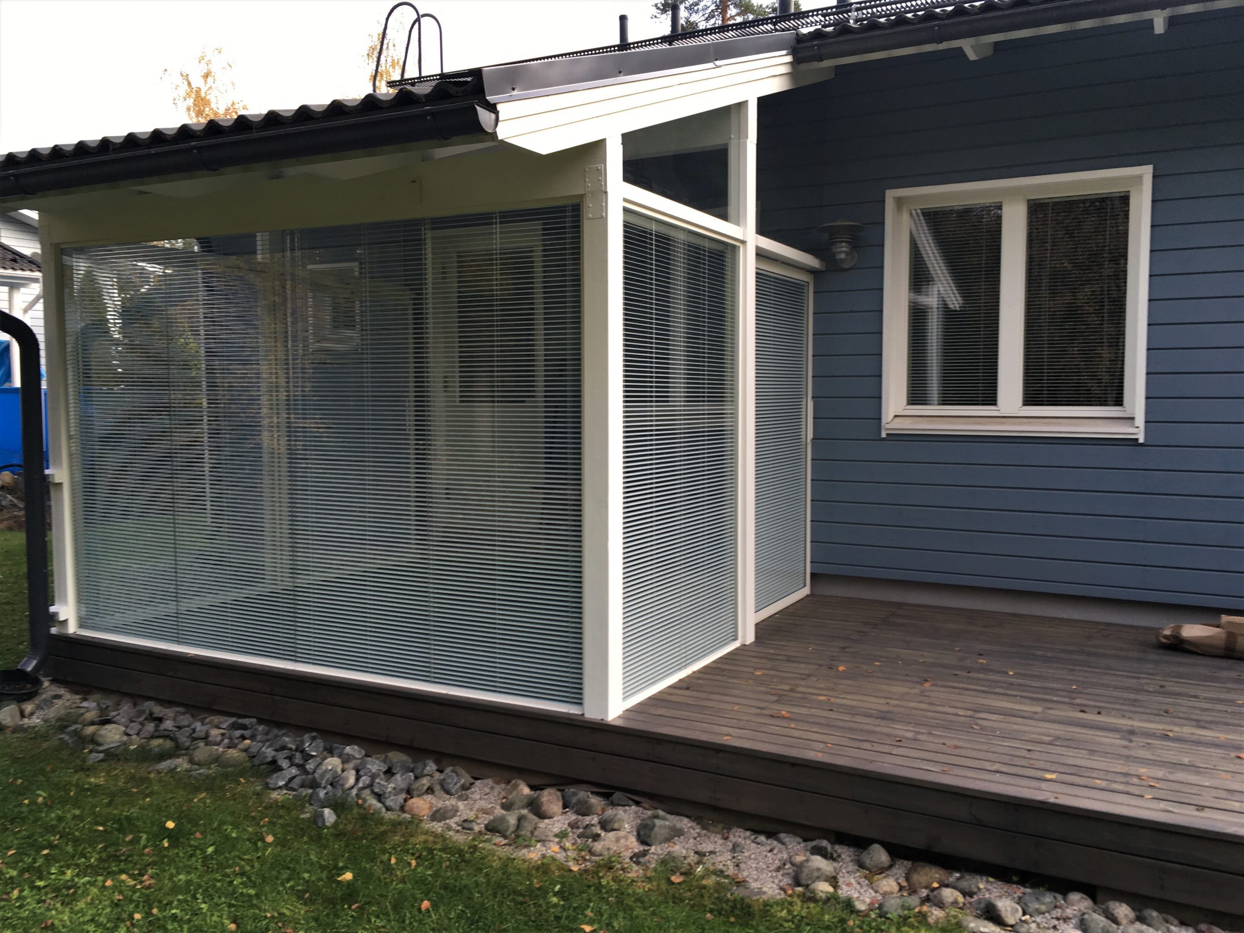 Sälekaihtimilla näkösuojaa lasitettuun terassiinLiukulasit, Omakotitalot - omakotitalojen lasitukset, Sälekaihtimet / 3.9.2019 KOHDE: Omakotitalo Lieto TUOTTEET: Pystypuitteeettomat liukulasit, sälekaihtimet, kiinteät aukkolasit. Sälekaihtimilla saadaan tarvittaessa suojattua terassi suoralta auringonpaisteelta ja katseilta. Sälekaihtimet ovat aika huomaamattomat eivätkä häiritse näköyhteyttä luontoon. Täysi näkösuoja sälekaihtimilla.