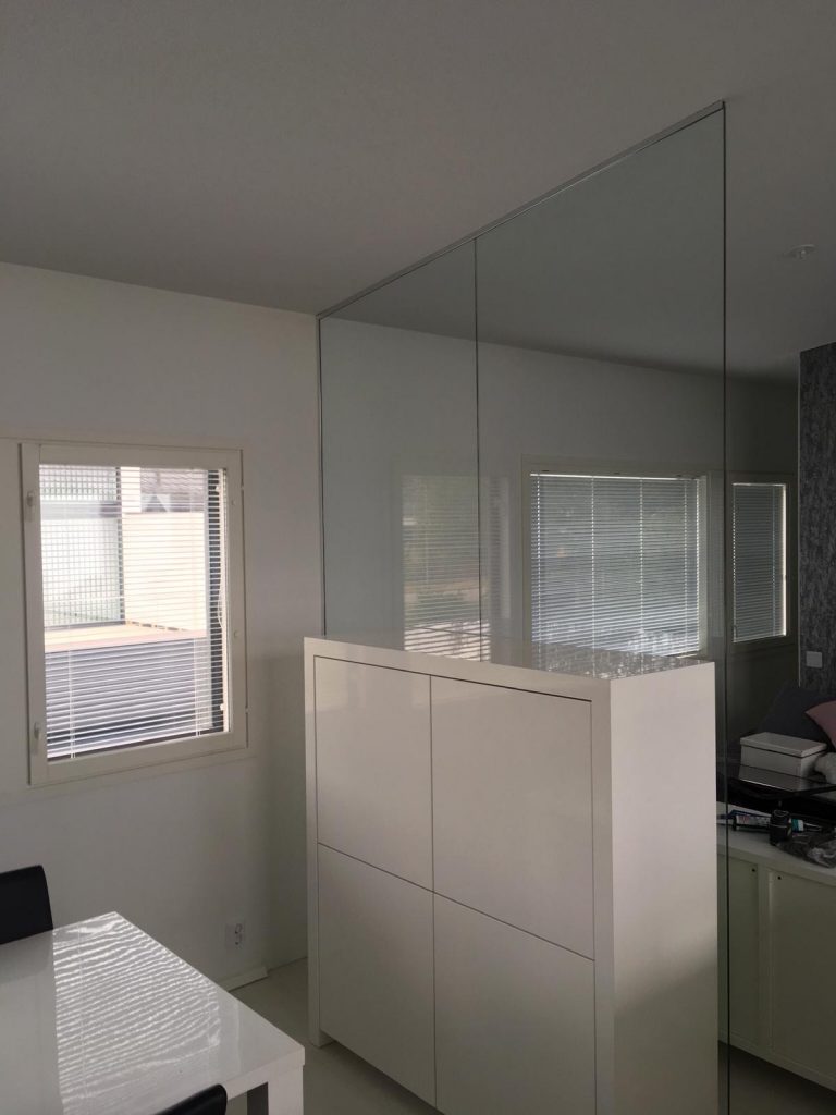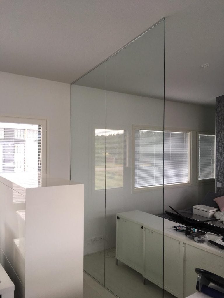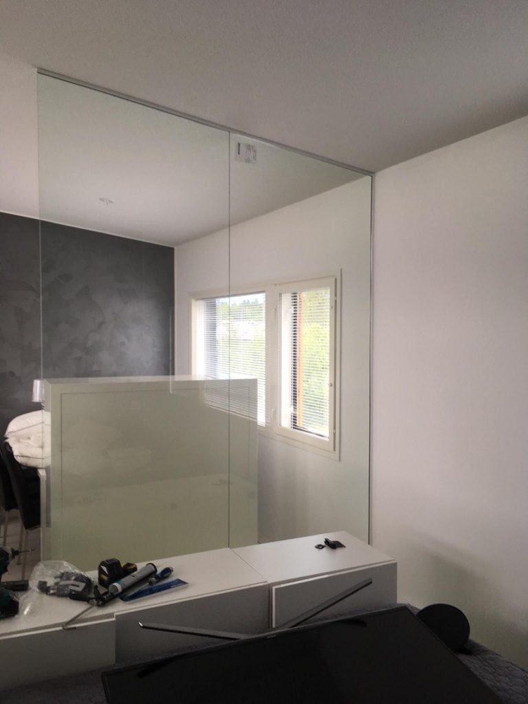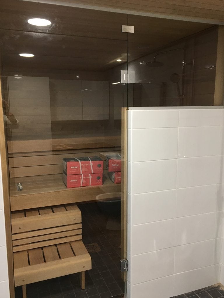 TUOTTEET: Saunan lasiseinät ja lasiovet 17 huoneistoon. Osaan asuntoja asennettiin myös tulevien asukkaiden toiveiden mukaisesti kylpyhuoneen seinä- ja ovilasit. Yhteen huoneistoon makuuhuoneen ja oleskelutilan väliin lasiseinä.