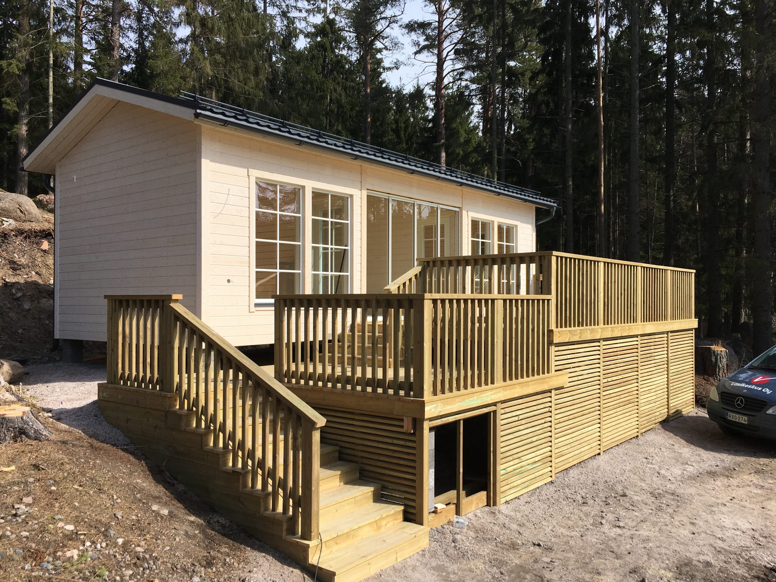 Vierasmajan liukulasitus NauvossaKesämökit, Liukulasit / 4.4.2019 KOHDE: Vapaa-ajan asunnon vierasmaja, Saaristomeren kansallispuisto Nauvo TUOTTEET: Pystypuitteelliset liukulasit Asennuspäivän aamu.
